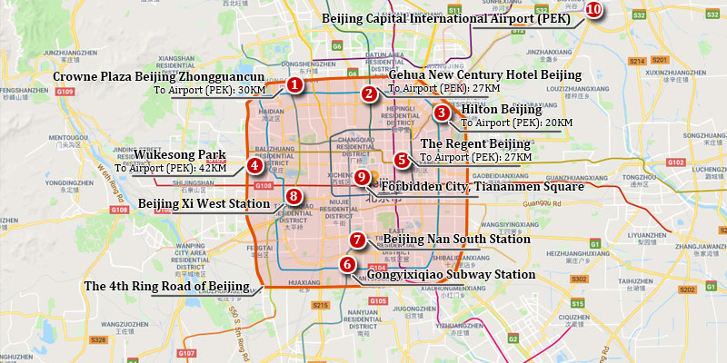 Gehua New Century Hotel Beijing, address: No.19, Gulou Outer Street, North 3th Ring Road, Chaoyang District, Beijing. Closed to Exit E of Anyuanqiao Subway Station (Line No.8). Taxi from aiport: 27km far, cost approx. US$20 one way. - Book additional transfer service with us. Cost will be advised by your travel advisor according to your hotel location.